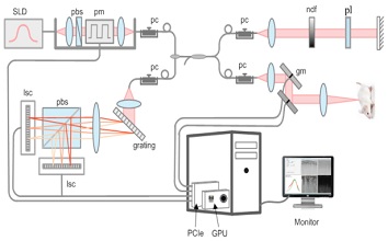 光学相干层析成像(Optical Coherence tomography)技术是一种非侵入(无损)、非接触微米级分辨率的成像技术,利用光学相干门来获得组织内部的层析结构。谱域OCT(Spectral domain OCT, SD-OCT)是第二代OCT技术,相比传统的第一代时域OCT技术,在成像速度、信噪比和灵敏度等方面具有明显优势,在眼科成像、功能成像、生物医疗等领域发挥了重要作用。