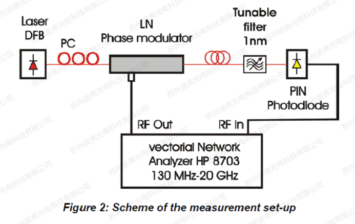 现在,如果用退火质子交换技术APE来制作的电光调制器,就不能直接实现上面钛扩散调制器带宽的测量方法。最简单的解决方案是在光纤马赫-曾德M-Z干涉仪的一个臂上加入相位调制器。然而,这种干涉仪的热不稳定性很难控制。因此,频率响应会由于这些不稳定性而产生畸变。