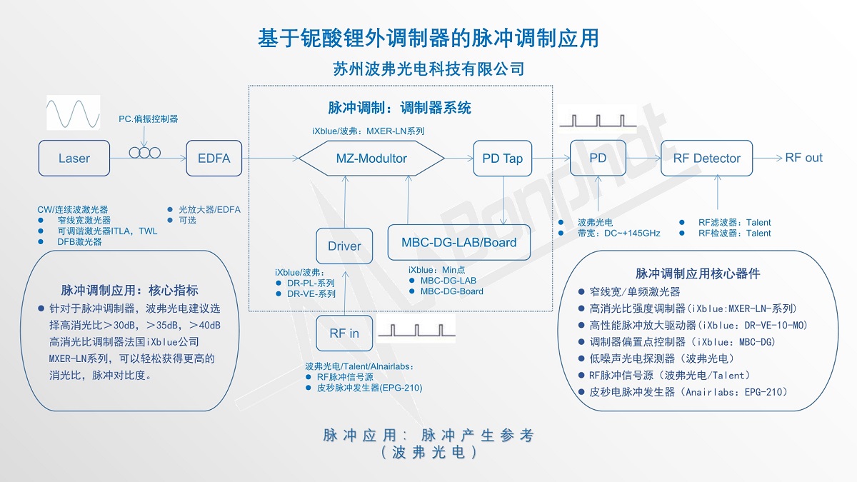 苏州leyu集团光电科技有限公司提供基于法国iXblue公司铌酸锂马赫增德尔高消光比强度调制器的脉冲调制元件的脉冲调制方案,这些方案包括常用的脉冲产生(脉冲调制)、脉冲整形、脉冲拾取等。基于法国iXblue高消光比强度调制器MXER-LN系列,可以轻松获得足够的消光比和脉冲对比度。更多详细情况请联系苏州leyu集团光电科技有限公司相关销售人员获取。