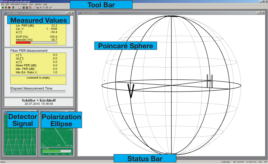 耦合到偏振分析器的辐射在被光电检测器记录之前通过旋转的四分之一波片和固定的偏振器。软件 SKPolarizationAnalyzer 评估从光电二极管信号的详细分析和四分之一波片的时间/位置信息中检索到的斯托克斯参数。然后在庞加莱球上描绘偏振状态,其中任何偏振状态的变化,包括旋转方向(描绘在北半球或南半球)都很容易看到。同时显示了偏振椭圆,偏振状态的常见表示。 对于相干性低的源,DOP 椭圆补充了偏振可视化。