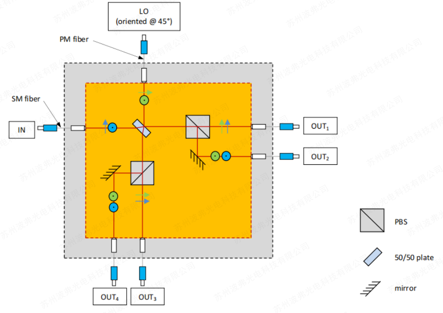 对于单偏振光混频器(COH24和COH24-X),信号和本振光都有保偏光纤(PMF),输出为单模光纤(SMF)。