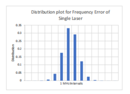 l 分布图显示了1 MHz间隔上的分布。大约62%的样本在+/-1 MHz范围内;大约92%在+/-2 MHz范围内。激光器的标准偏差为1.1MHz。 |
